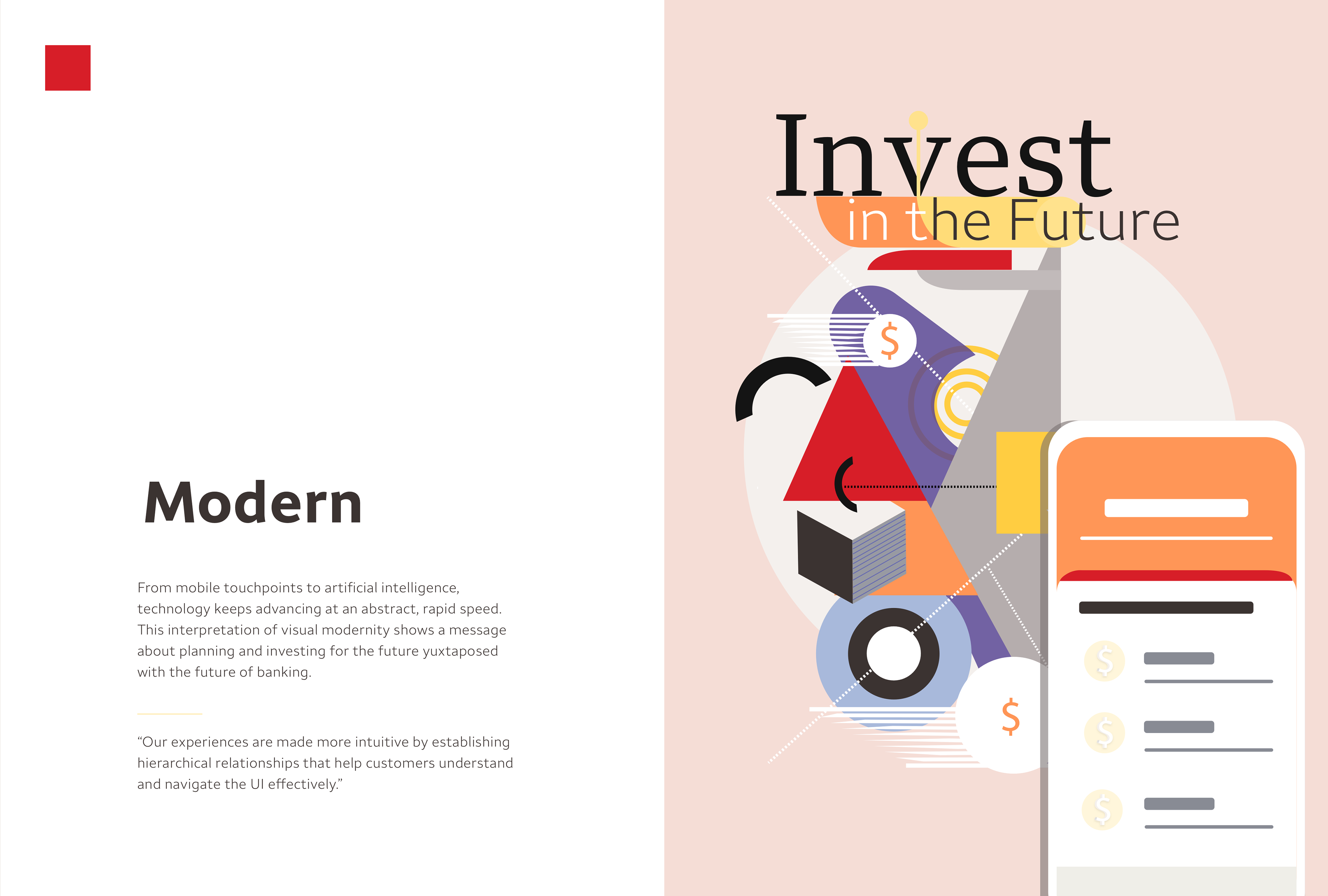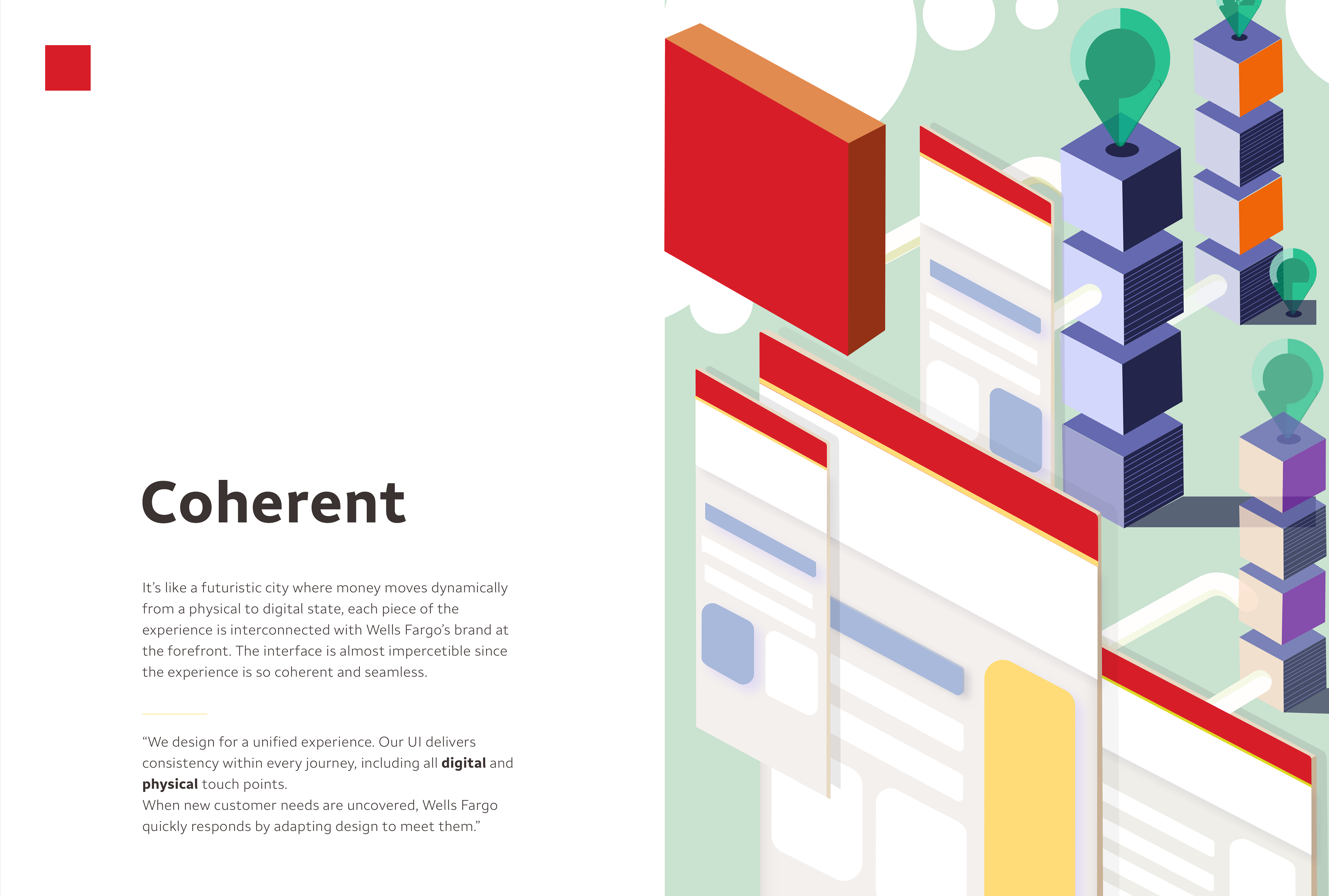 Winner of internal visual design "shoot out" to represent Wells Fargo's brand principles. Applied creative process to evoke emotions visually through the use of color, layout and visual metaphors.